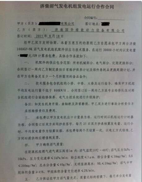 兩臺濟柴16V190沼氣發電機組技術支持及配件供應合同簽訂
