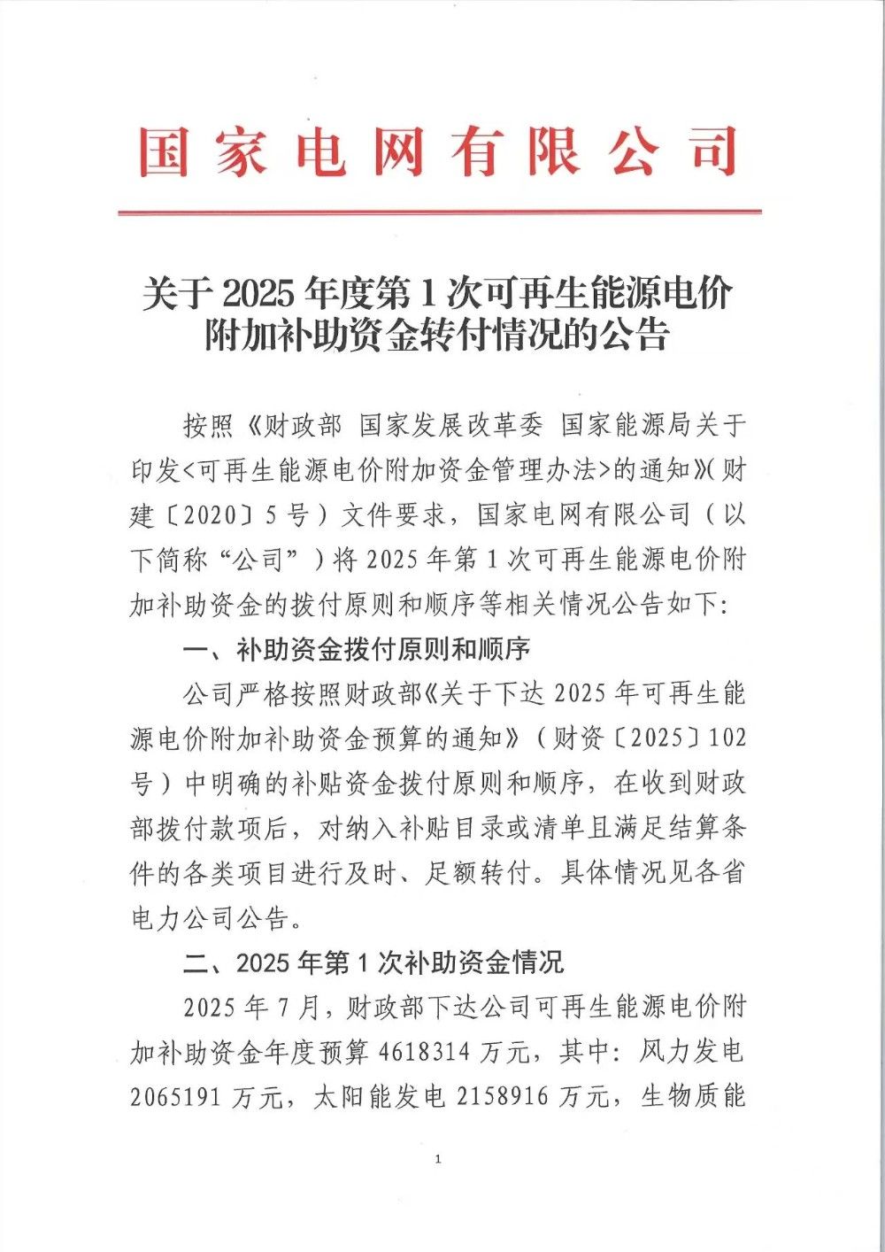國(guó)家電網(wǎng)有限公司關(guān)于2025年度第1次可再生能源電價(jià)附加補(bǔ)助資金轉(zhuǎn)付情況的公告